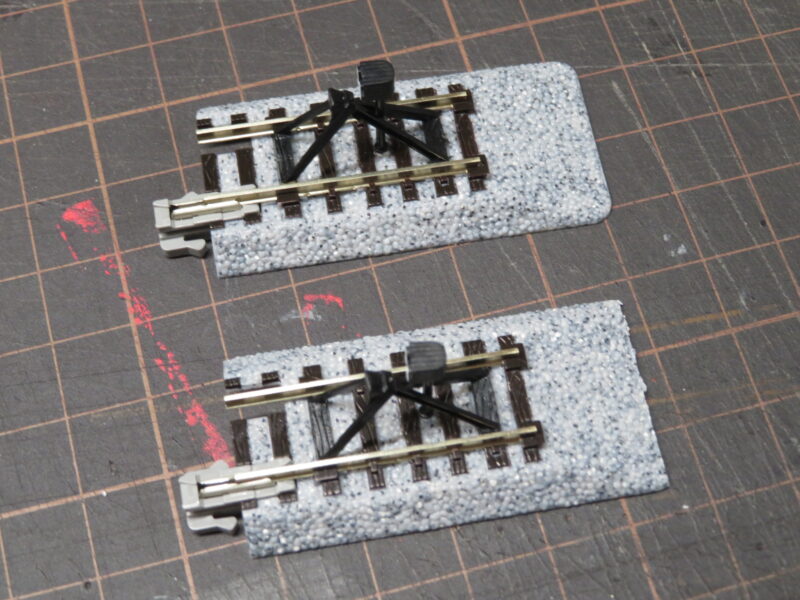 そして線路の周りを短冊状にしたスチレンボードを貼り付けてグレーのポスカで塗り、ボード手前に2mm角の角棒を貼り付けて終了。