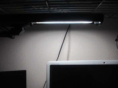 その後作業部屋のメタルラックにライトを取り付けて…。