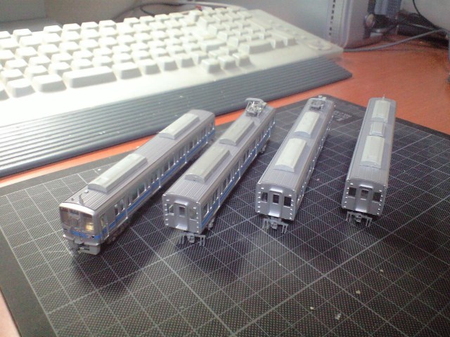 昨日から製作していたGMの小田急1000形であるが、今朝ほどステッカーとかデカールも貼って完成。屋根上のクーラーとかその辺だけ塗装しなおしたかな。これで20年来のリベンジが一応済んだところか。大変だったのは先頭車の手すりとスカート。手すりは前面の窓ガラスをはめ込んでから0.5mm(指定は0.3mm)のドリルで穴を開けてやったけど大変だった。そしてスカートはTNカプラーに対応させるのに手間取ったかなという感じ。でも一応形にはなったのでいいかな。
