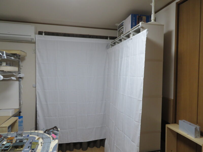 ZOOMでのオンライン会議用に模型部屋の模様替えをして、本棚と窓の茶色いカーテンを白く隠すために背景用の白い布と突っ張り棒とフックを購入して設置したのが10月中旬の話。
